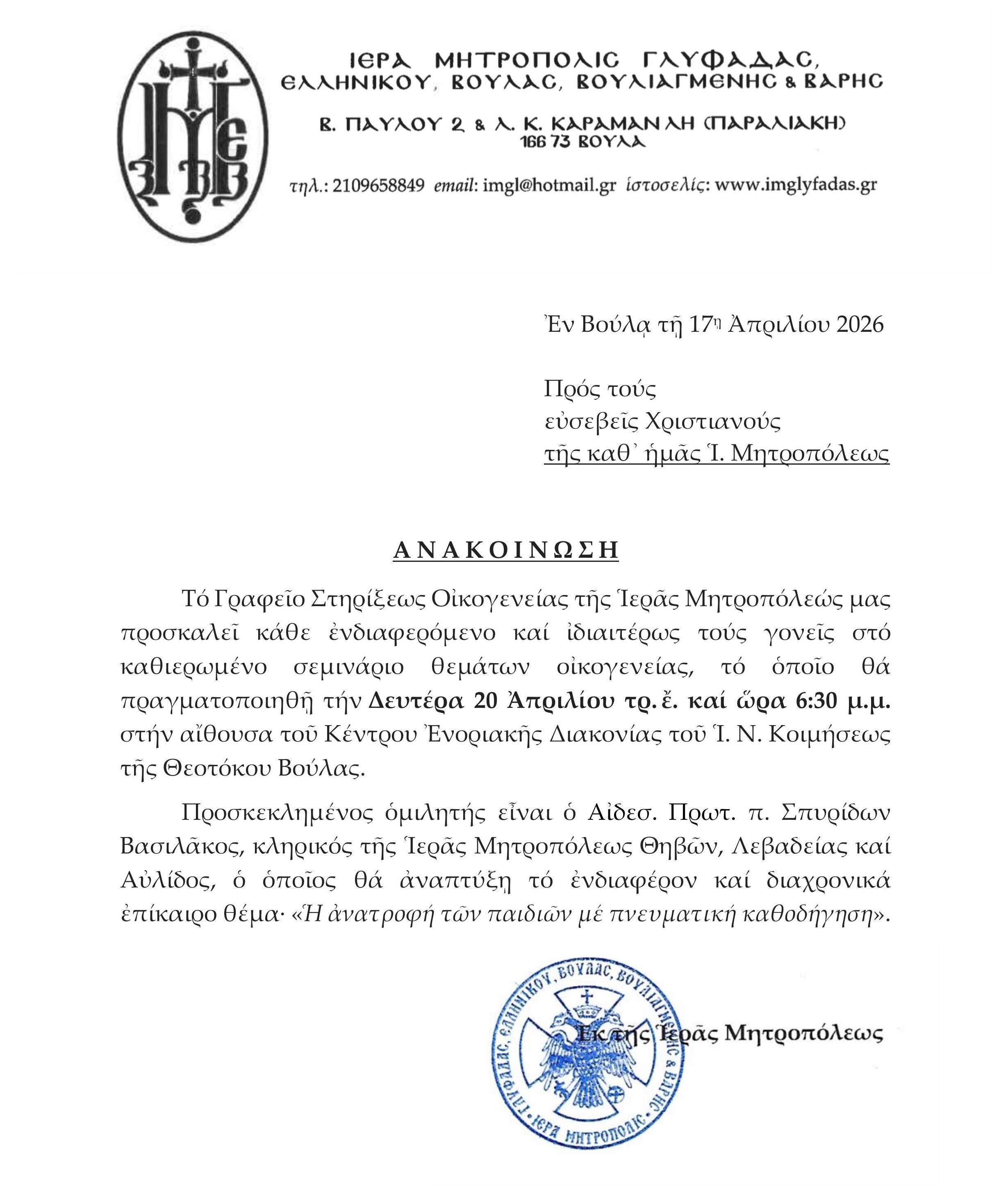 ΣΕΜΙΝΑΡΙΟ ΠΕΡΙ ΟΙΚΟΓΕΝΕΙΑΣ (20.4.2026)